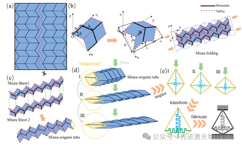 图1 (a)由平行四边形阵列组成的三浦折纸镶嵌的折痕图;(b) 三浦薄板单元和折叠过程的几何模型;(c)由两个相同的三浦板组成的三浦管的几何模型;(d)“凸出”状态下三浦折纸管的垂直压缩;(e)受折纸结构启发的QZS结构的工艺演示。