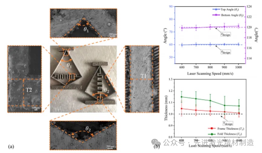 图4 (a) LPBF制造的QZS零件的角度、框架和褶皱厚度示意图;(b)激光扫描速度对LPBF制造的QZS零件锥角、框架厚度和褶皱厚度的影响。