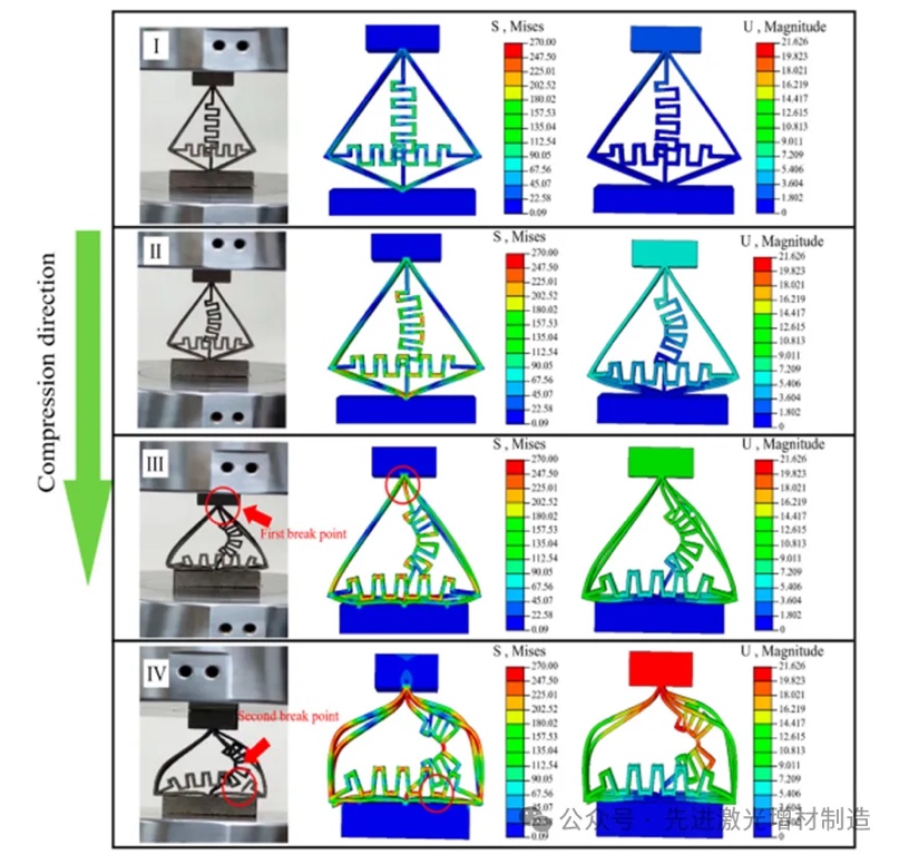 图6为LPBF制造的QZS结构在不同阶段随载荷增加的压缩试验中von Mises应力和幅值的实验记录图像及相应的有限元模拟结果。随着顶部刚性压板的下降,应力被诱导到QZS部分,应力首先集中在褶皱区,这也是第一次断裂的位置。随着载荷的增加,应力集中越来越明显,最终导致断裂。在第一次断裂后,横向褶皱底部出现了更明显的应力集中。