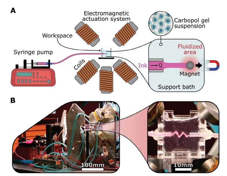 因此,荷兰特文特大学Franco N. Piñan Basualdo及其团队开发了一种嵌入式打印方法,消除了对喷嘴的需要,使用磁性球作为嵌入式3D打印的绘图部分,称为无磁性喷嘴嵌入式3D(MagNoFE3D)技术。
