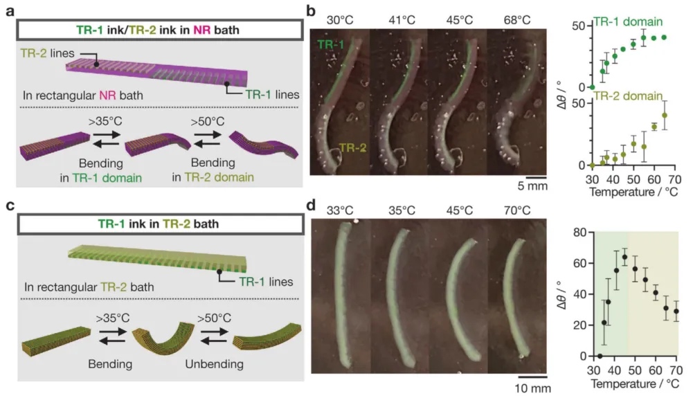 本文提出得4D打印方法的优点之一是能够使用不同温度响应的微凝胶将多种响应引入单个结构(图6)。例如,TR-1和TR2油墨都被印刷到矩形NR槽的不同区域,TR-1微凝胶在30-50°C范围内先发生弯曲,而TR-2微凝胶在50°C以上才开始弯曲,形成了分步形变的结构。总的来说,不同温度响应型微凝胶的组合,能够在同一结构中实现分步形变。这种设计为实现多功能、复杂的软体机器人或自适应材料提供了新思路,能够根据环境温度的变化进行多阶段的形状调整。