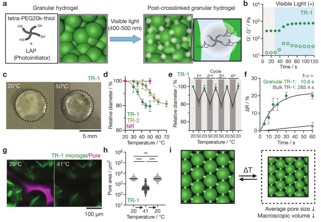 为了稳定颗粒状水凝胶,研究者在间隙空间中引入四臂聚乙二醇硫醇(tetra-PEG20k-thiol)和LAP,以实现TR-1微凝胶的颗粒间后交联,微凝胶上剩余的降冰片烯与四臂聚乙二醇硫醇上的硫醇发生反应(图3a)。光流变学测量显示,光交联大幅提高了水凝胶的机械强度(图3b)。优化交联后的条件,发现0.5 mM的四臂聚乙二醇硫醇在不降低温度响应性的情况下具有最高的稳定性,并能产生自支撑的TR1颗粒水凝胶(图3c)。随着温度升高,水凝胶的孔隙迅速缩小,并表现出可逆的体积变化(图3d-h)。图3i总结了颗粒水凝胶在加热和冷却过程中的分层结构响应示意图,展示了微凝胶的协同收缩导致的宏观体积变化。