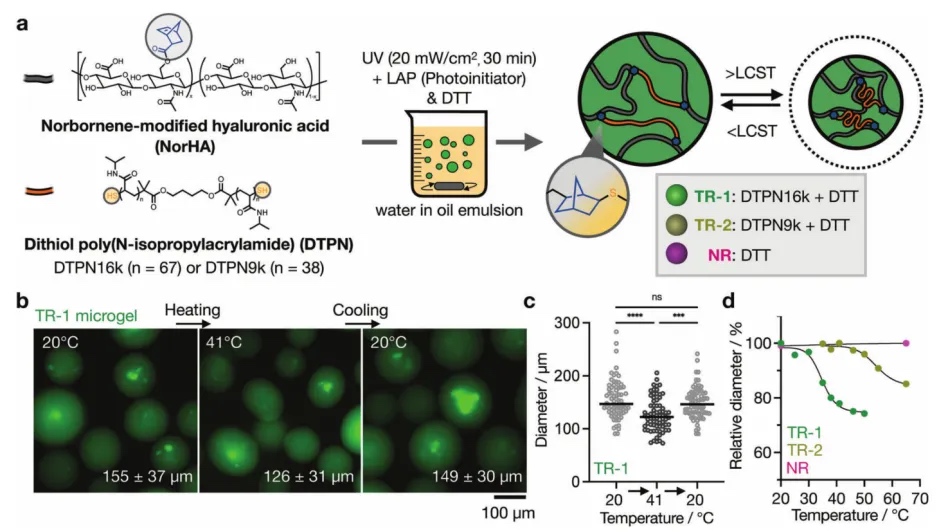 本文通过可逆加成-破碎链转移(RAFT)聚合合成了二硫醇功能化的pNIPAM (DTPN)交联剂。DTPN通过光引发的巯基反应与降冰片烯修饰的透明质酸(NorHA)交联,形成微凝胶。这些微凝胶在加热到临界溶解温度(LCST)以上时会表现出体积减小的温度响应行为(图2a)。图2b显示了DTPN16k(温度响应型1微凝胶,TR-1微凝胶)在不同温度下的代表性显微图像,表明微凝胶的体积变化是可逆的。此外,不同交联剂和分子量的微凝胶在不同温度下的体积变化不同(图2c)。