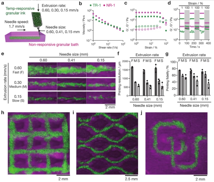 为了制造具有响应性和非响应性水凝胶代表的不同成分的多材料物体,研究者开发了颗粒水凝胶墨水和悬浮浴的悬浮浴印刷技术。具体而言,制备NR颗粒水凝胶作为悬浮浴来支持TR颗粒水凝胶油墨(图4a)。流变测试验证了其适合打印的力学性质(图4b-d)。通过不同的挤出速度和针头尺寸打印的线条图像,量化了不同条件下的打印分辨率和精度,结果显示:较慢的挤出速度和较大的针头尺寸可以提高打印精度(图4e-g)。可以利用悬浮浴打印各种图案,表明该方法可以实现高分辨率和高保真的打印效果(图4h-j)。