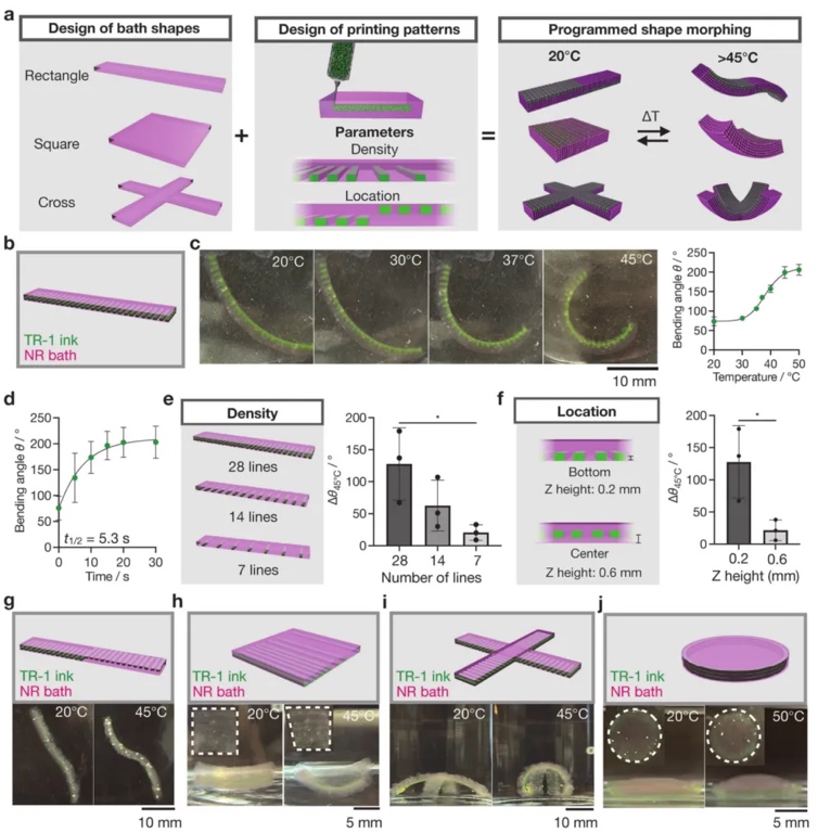 随后,研究者展示了可编程形变颗粒水凝胶的4D打印,通过不同的打印图案和悬浮浴形状,实现复杂的动态形变。图5a展示了通过悬浮浴打印实现颗粒水凝胶的可编程形状变形,打印的图案和悬浮浴的形状决定了打印结构的动态形变方式。研究者展示了在矩形非响应型(NR)水凝胶中,温度响应型(TR-1)线条的打印方式,以及在加热过程中发生的弯曲形变。图5b-c量化了不同温度下的弯曲角度,显示出TR-1水凝胶的快速温度响应和显著形变。此外,通过增加TR-1打印线条的数量和调整打印位置(如靠近底部或中间),展示了弯曲角度的变化,进一步证明了形变强度取决于打印图案的密度和位置(图5d-f)。图5g-j展示了几种更复杂的形变结构。