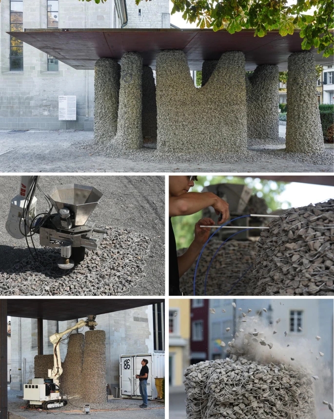 冲击打印利用本地可回收材料,这些材料不仅成本低廉,而且易于获取。苏黎世联邦理工学院的SNSF Bridge研究员Lauren Vasey领导的团队开发了一种机器人工具和方法,可以将建筑工地挖掘出的材料转化为高质量的建筑产品。