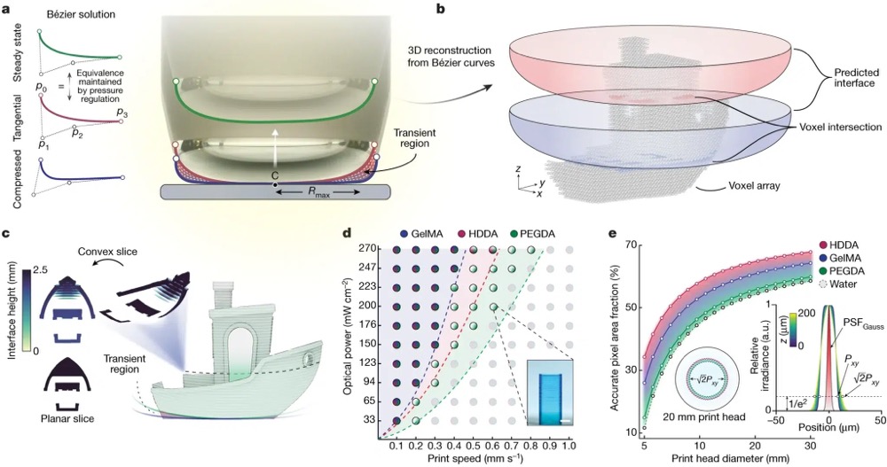 与传统立体光刻技术相比,无层打印方法显著提升了打印速度,能够在几秒至几分钟内完成整个3D结构的打印。这不仅提高了产量,还减少了生物材料暴露于光线下的时间,降低了对细胞健康的潜在损害。凸面切片技术使得DIP能够动态适应不同材料和结构,同时消除对支撑结构的需求,确保高保真度。