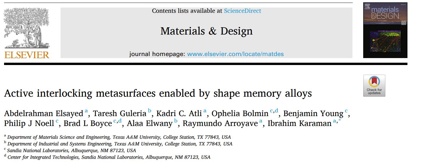 2024年11月,近日,德克萨斯农工大学与桑迪亚国家实验室的研究团队在Materials & Design期刊上发表了一篇关于互锁超表面(Interlocking Lattices Metamaterials, ILM)的重要研究,研究题目为Active interlocking metasurfaces enabled by shape memory alloys(由形状记忆合金驱动的主动互锁超表面)。该研究利用形状记忆合金(Shape Memory Alloys, SMA)和3D打印技术,开发出一种新型的主动互锁超表面技术,有望在航空航天、机器人技术和生物医学设备等领域带来革命性的变化。