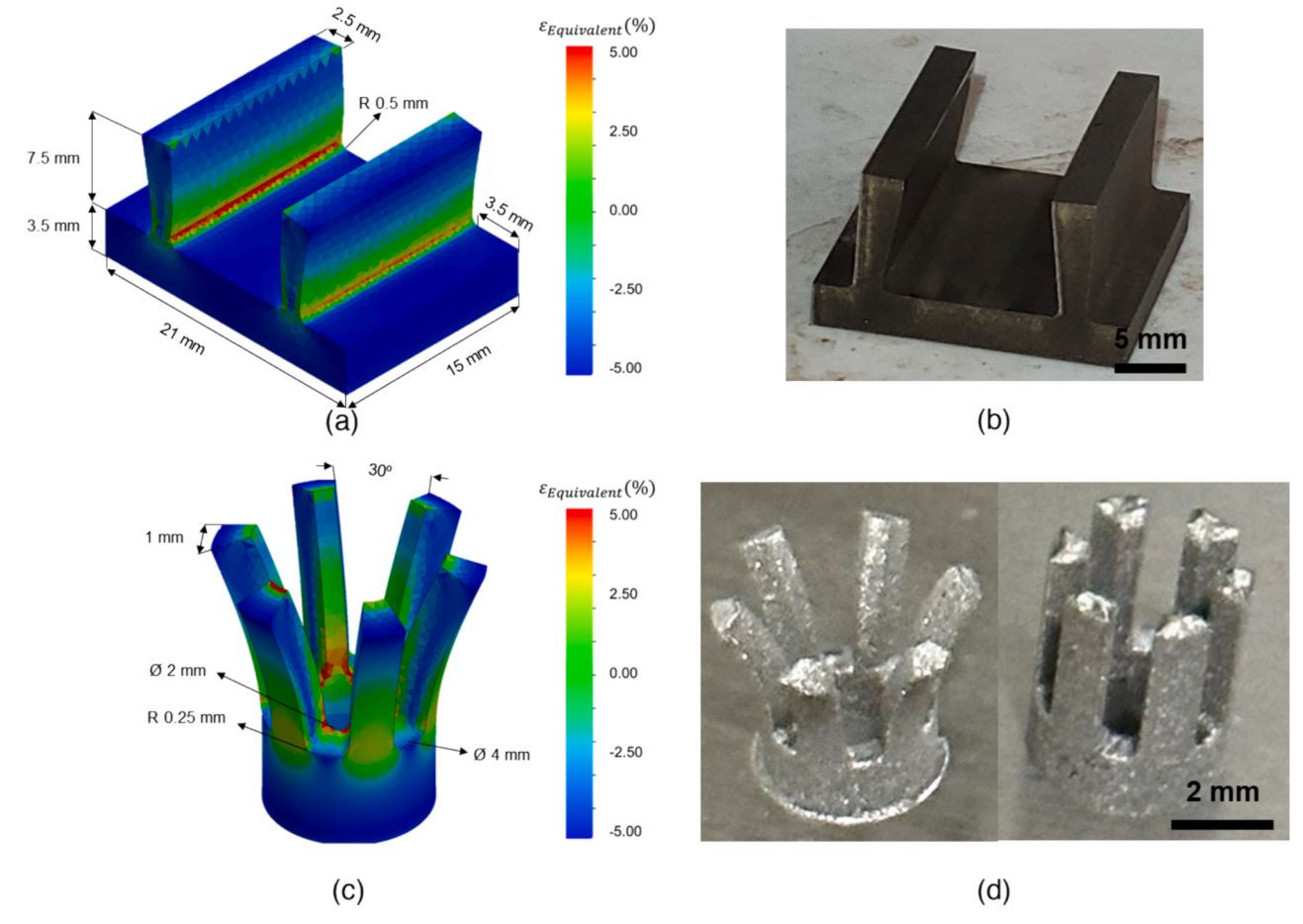 △(a) 利用Solidworks Nitinol材料模型对捏合握持(PG)设计单元结构进行等效应变的3D建模和模拟;(b) 使用近等原子比例的镍钛合金制造的PG设计3D模型;(c) 对扩展锚(EA)设计单元结构进行等效应变的3D建模和模拟。(d) 使用近等原子比例的镍钛粉末3D打印的EA设计模型。