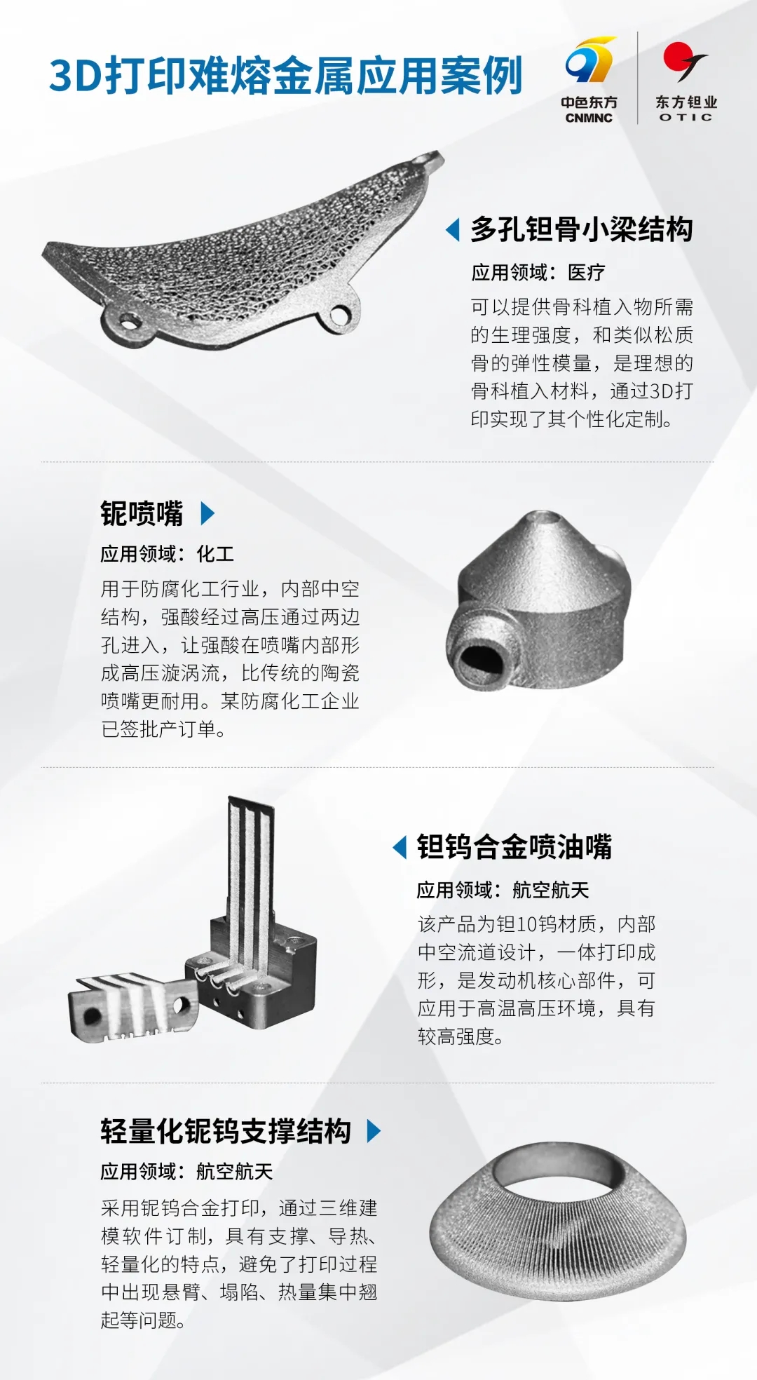 金属3D打印技术作为一种先进的绿色智能制造技术,其材料利用率高,无需模具即可成形复杂构件,这为难熔金属加工制造提供了新方法。2024年11月11日,宁夏东方智造与华曙高科携手,基于华曙高科设备开源优势,联合进行了新材料和针对性工艺的开发,解决了难熔金属的激光精密成形难题,产品打印性能稳定,持续为航空航天、医疗、化工等领域提供难熔金属大尺寸、产业化3D打印解决方案及打印服务。据悉,成立于2021年的宁夏东方智造科技有限公司,由宁夏东方钽业股份有限公司和内部核心项目团队人员共同出资成立,以难熔金属、难熔金属基合金、难熔高熵合金冶炼加工、球形钽粉、钽钨合金粉、铌粉、铌钨合金粉加工与销售3D打印产品设计、3D打印服务、3D打印产品销售为主营业务。