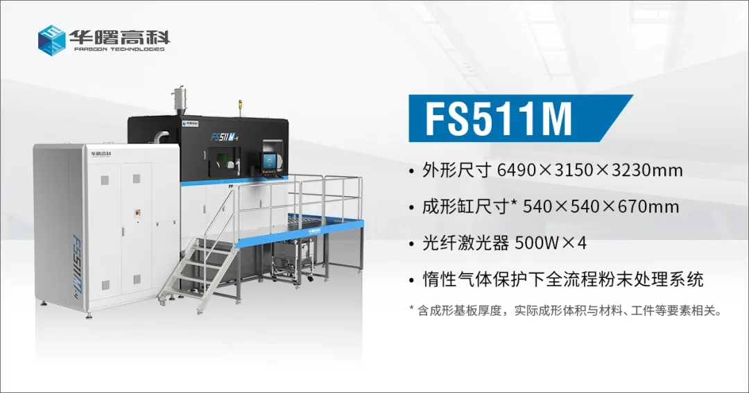 FS511M是华曙高科于2023年发布,针对批量化增材制造推出的四激光双向铺粉金属增材制造设备。FS511M配备自研全套操作系统,可实现产线布局,其成形缸尺寸为540mm×540mm×670mm(含成形基板厚度),标配4×500W激光,最大体积成形效率可达100cm3/h。