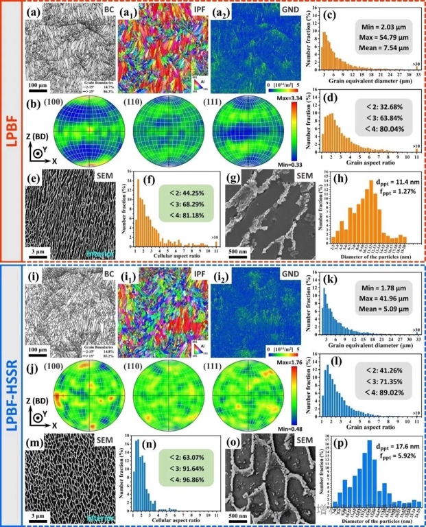 ▲图1 沉积试样的微观组织。(a-a2)(i-i2)带对比度、反极图和GND分布图;(b)(j)分别对应(a1)(i1)的极图;(c-d)(k-l)晶粒等效直径和长宽比;(e-f)(m-n)胞状亚结构的SEM图像以及长宽比分布图;(g-h)(o-p)Al基体内部析出相的SEM图像以及尺寸分布图。