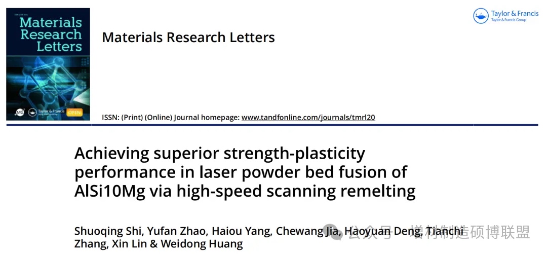近期,题目为“Achieving superior strength-plasticity performance in laser powder bed fusion of AlSi10Mg via high-speed scanning remelting” 的研究论文发表在Materials Research Letters上。论文第一作者为西北工业大学材料学院博士生史硕晴,通讯作者为林鑫教授、赵宇凡教授以及杨海欧副研究员,第一通讯单位为西北工业大学凝固技术国家重点实验室。
