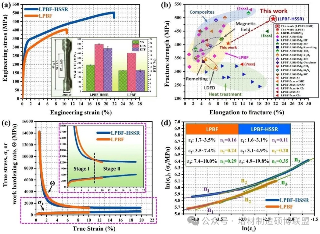 对两组试样进行了室温拉伸(图2)。与常规的LPBF试样相比,HSSR试样的屈服强度、抗拉强度和断裂延伸率分别提升了27.3%,22.5%和103.8%。对比图中列举了增材制造外加辅助场、后续热处理、常规重熔、添加强化颗粒等不同工艺条件下AlSi10Mg合金,以及添加稀土元素改性的高强铝合金的拉伸性能。可知,利用HSSR策略,合金的断裂强度和延伸率同时显著提升,在目前已知数据中表现最为突出。通过对加工硬化指数的进一步分析可知,HSSR策略试样具有显著的加工硬化能力,且随着拉伸应变的不断提升,加工硬化指数逐渐升高,从而可以获得优异的拉伸强度。