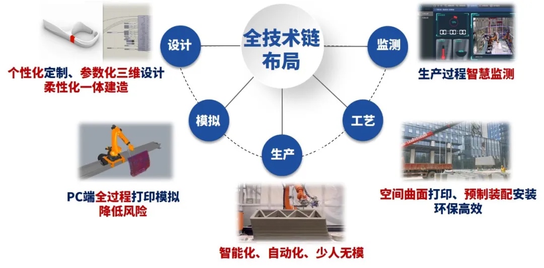 八载春秋,一公院“智造”团队顺应工程结构智能建造模式的发展趋势,聚焦混凝土3D打印技术的结构、材料、装备、系统等全产业链环节开展核心技术攻关。建立了完整的工程增材建造技术体系,提出了多种数字化参数化建模方法,完全自主研发三大系列3D打印水泥基材料,研制了面向工厂预制式及原位打印的机械臂式、龙门式等多种3D打印装备、五代混凝土3D打印工具端,软硬件高度集成的混凝土3D打印控制系统、混凝土3D打印路径规划系统以及混凝土3D打印质量控制技术体系,并进行了相应的工程测试及应用实践,填补了陕西和中交集团在混凝土3D打印方面的空白,达到国际先进水平。