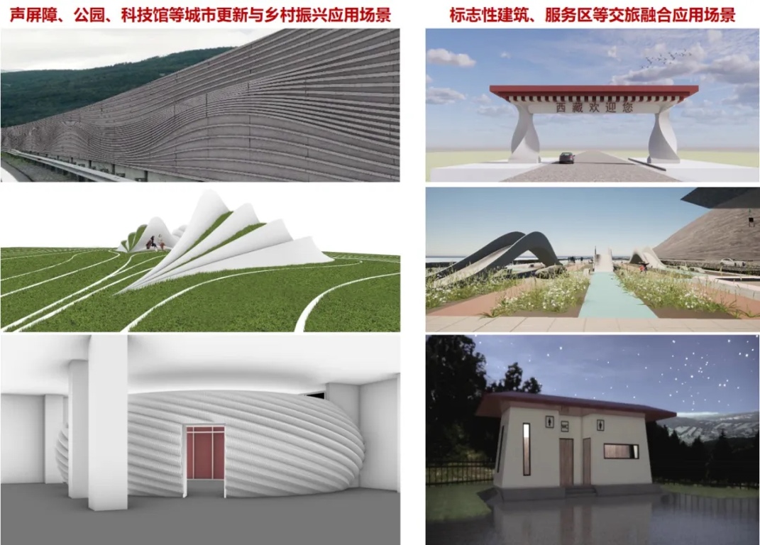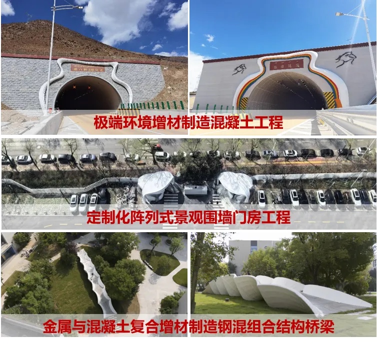 技术成果支撑多项工程项目8项,包括极端环境增材制造混凝土工程-世界屋脊第一长隧G6高速公路羊八井隧道群、定制化阵列式景观围墙,以及金属与混凝土复合增材制造钢混组合结构桥梁等。在景观小品、市政景观设施、交通基础设施等领域取得显著成效,实现人工工时节省50%,成本下降约40%,支撑科技创新、节省工期、节能减排、提升品质、减少材料使用量等,产生间接经济效益约2000万元,推进了基础设施建造技术的绿色化、工业化和智能化升级。