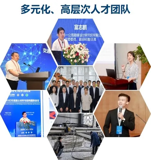 2016年,当3D打印技术在工程建设领域尚处萌芽阶段时,一公院抢抓发展机遇,成立了结构智能建造专职研发中心,开启了3D打印技术在交通基础设施建设中的“拓荒”之旅。鉴于混凝土3D打印技术是一项跨学科、复杂而前沿的研究领域,深度融合了材料、建筑、结构、机械、计算机等多个学科,仅凭单一专业和一腔热血无法快速步入并走向前列。因此,在中交集团及中交一公院各级领导的全力支持下,富志鹏(中交一公院副总经理,极端环境绿色长寿道路工程全国重点实验室副主任、学术带头人,工程技术研究院院长)带领姚晓飞(中交一公院智能建造副总工程师,结构智能建造研发中心主任)与杨敏(结构智能建造研发中心副主任),召集横跨桥梁、结构、建筑、材料、机械自动化、软件开发、机器人技术、安全工程等多个专业领域的优秀人才,从最初的3人扩展至近30人,形成了以高级职称专家为引领,博士、硕士为主体的全专业链多元化、高层次人才团队。