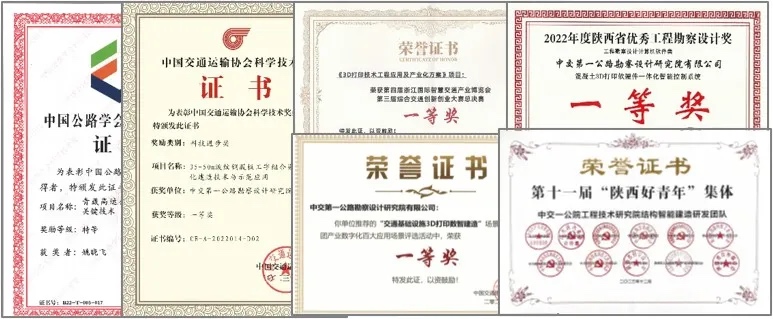 时至今日,一公院已具备集软硬件设备、材料制备、产品设计和打印服务于一体的3D打印智能建造技术全产业链,积累了具有核心竞争力的知识产权群组。共承担科技研发项目近40项,合同总额6000余万。围绕材料、装备、控制系统与平台、建造工艺等全技术链形成具有完全知识产权的科研布局和攻关研究,授权专利27项、软件著作权4项,发表SCI检索及中文核心等高质量学术论文近30篇,主、参编标准规范7部,获得国家级、省部级、行业协会等荣誉奖励16项。代表性成果“混凝土3D打印软硬件一体化智能控制系统”相继获得陕西省优秀工程勘察设计奖(计算机软件类)、第二届全国交通行业职工岗位创新标杆成果、中交集团第三届职工岗位创新成果及中交集团科技进步一等奖,认定为“国际领先”水平,奠定了一公院在交通建设行业中3D打印技术领先地位。