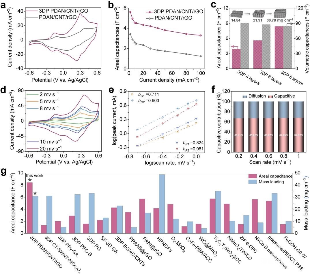 图4. PDAN/CNT/rGO电极的电化学性能。(a)扫描速率为8mV s−1时的CV曲线,(b)PDAN/CNT/rGO和3DP PDAN/CNT/rGO电极在不同电流密度下的面积电容;(c)3DP PDAN/CNT/rGO电极在2mA cm−2时的面积电容和体积电容;(d)3DP PDAN/CNT/rGO的CV曲线;(e)计算的不同氧化还原峰的b值;(f)不同扫描速率下电容和扩散控制电容的贡献率;(g)3DP PDAN/CNT/rGO与其他报道的厚电极的面积电容和质量负载比较。
