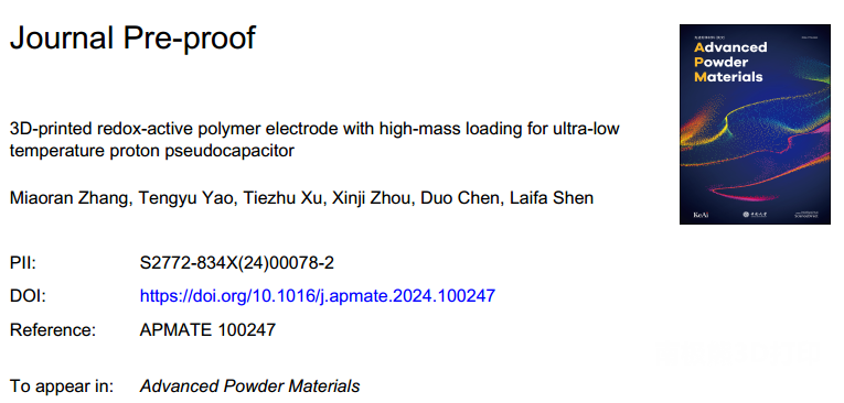 Miaoran Zhang, Tengyu Yao, Tiezhu Xu, Xinji Zhou, Duo Chen, Laifa Shen,3D-printed redox-active polymer electrode with high-mass loading for ultra-low temperature proton pseudocapacitor,Advanced Powder Materials,2024,100247,ISSN 2772-834X, https://doi.org/10.1016/j.apmate.2024.100247.