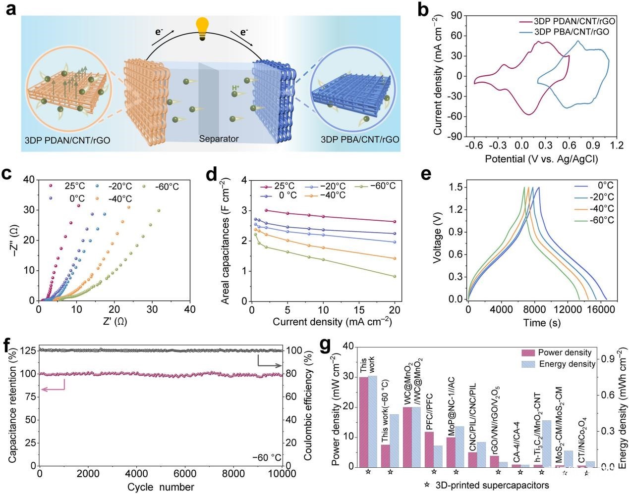 图 5. 超级电容器的低温性能。(a)3D打印 PDAN//PBA非对称超级电容器示意图;(b)扫描速率为 8mV s−1时3D打印 PDAN和PBA复合电极的CV曲线;(c)不同温度下3D打印超级电容器的EIS;(d)不同温度下的倍率性能;(e)电流速率为0.5mA cm−2时不同温度下3D打印超级电容器的典型GCD电位曲线;(f)−60°C时5mA cm−2下的循环性能;(g)3D打印超级电容器与其他最先进的超级电容器的面积功率和能量密度比较。
