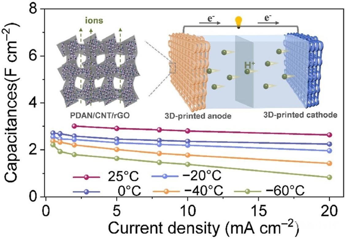 与传统方法(如化学气相沉积(CVD)和电沉积)不同,三维(3D)打印可以在3D空间中轻松、高精度、无模具、低成本地制造复杂物体。特别是,先进的直接墨水写入(DIW)3D打印技术可以修改电极结构,以提高离子可及性并在给定的覆盖面积内保持高质量负载,从而保证在面能量密度和长循环寿命方面取得显着进展。然而,关于3D打印高质量负载有机基电极以定制超低温质子伪电容器的相关研究目前还很少见。
