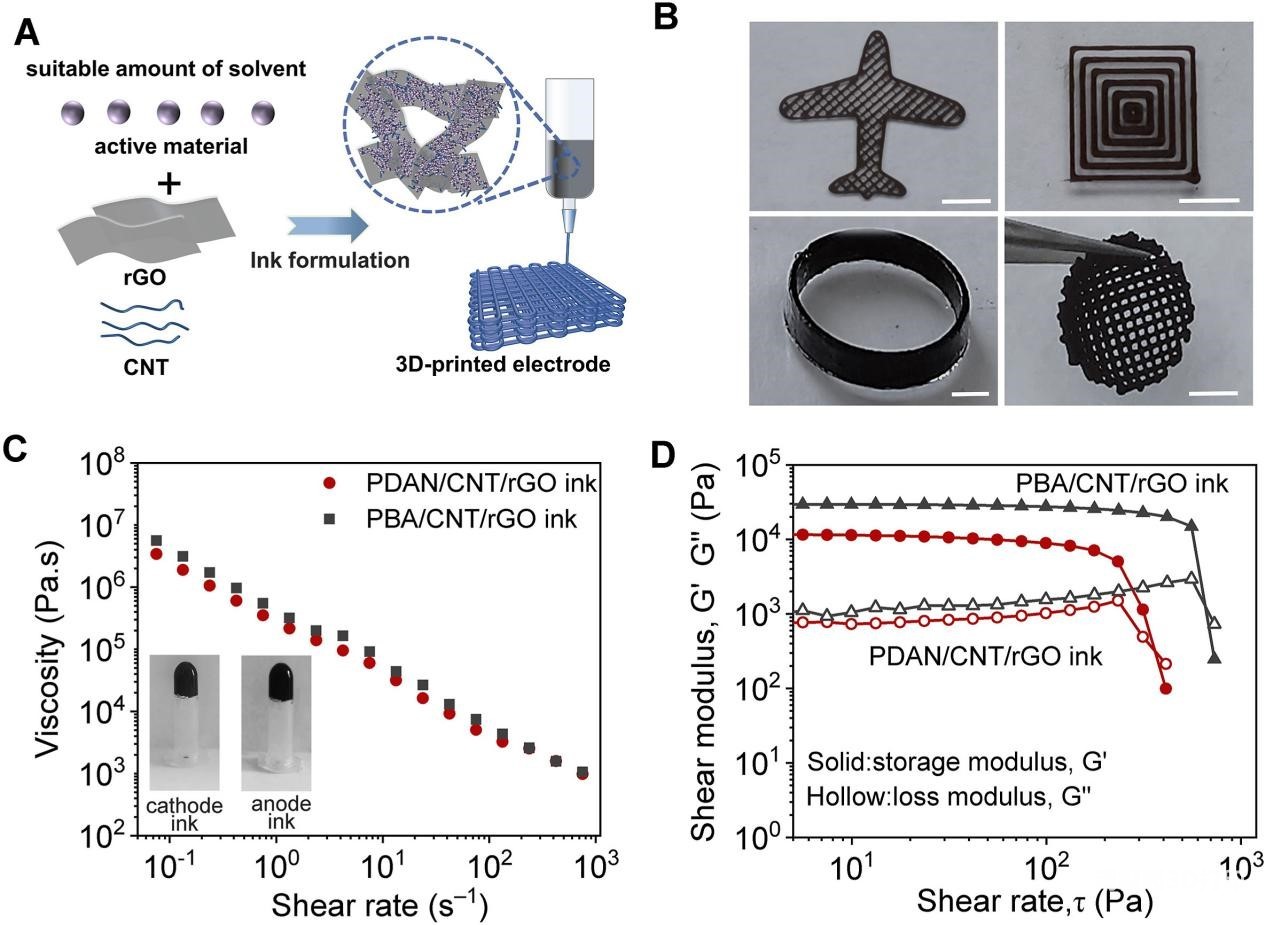 图 2. 油墨的制造程序和可印刷性。(a)整体印刷方案图和(b)3D打印电极图案的照片。所有比例尺代表0.5厘米。PDAN和Cu-普鲁士蓝(PBA)复合油墨的流变性质:(c)表观粘度与剪切速率的关系,以及(d)储能模量G'和损耗模量G”与剪切应力的关系。