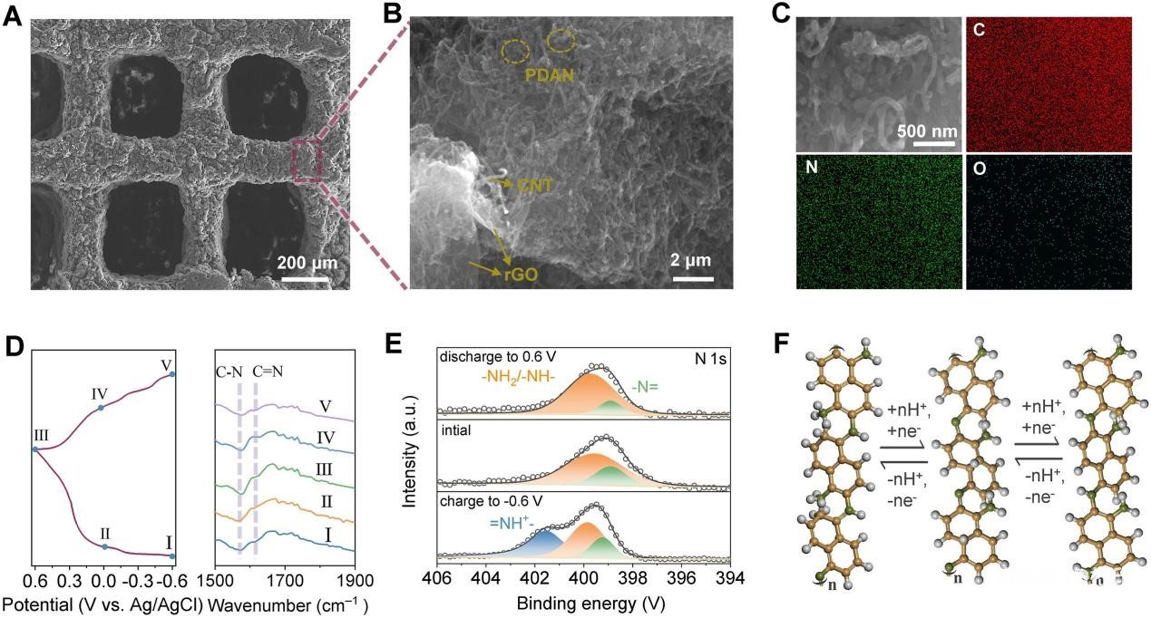 图3. 3DP PDAN/CNT/rGO电极的电荷存储机制。(a)3DP PDAN/CNT/rGO电极的顶视图SEM图像;(b、c) PDAN/CNT/rGO的SEM图像和相应的EDS元素映射;(d)不同电荷状态下的详细FTIR峰演变;(e)非原位 XPS N 1s 光谱;(f) PDAN 电荷存储机制示意图