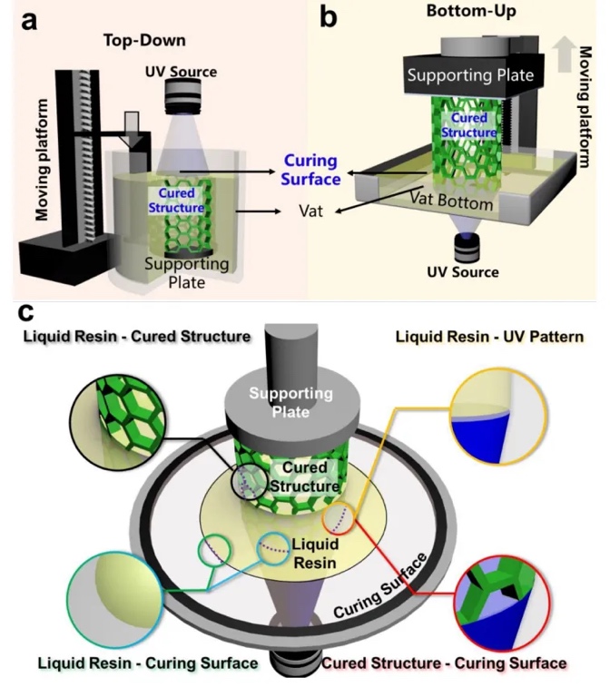 根据光源与支撑板的相对位置不同,有两种配置,包括紫外源位于支撑板上方的自上而下配置(图2a)和紫外源位于支撑板下方的自下而上配置(图2b)。两种配置下,打印过程都是在受约束的界面之间进行的:自下而上,打印过程是在槽底与固化的三维结构之间进行的;自上而下,打印过程是在顶盖与固化的三维结构之间进行的。两种配置的调控策略具有通用性,因此作者主要介绍自下而上的配置。