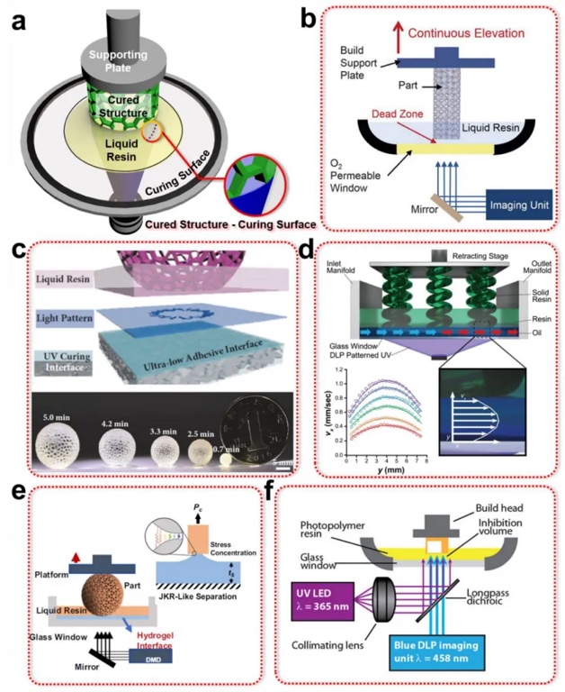 由于这三个步骤实际上是在紫外图样、固化结构和固化表面之间的界面上进行的原位界面固化过程,从界面角度来看,对固化所涉及的界面的调控将影响打印过程和打印结果。对于整个打印过程,它涉及到紫外图样、液态树脂、固化结构和固化表面之间的界面,如图2c所示。作者主要总结了界面策略来调控固体固化表面、固体固化结构和液态树脂的固液相接触界面,这些界面受到光源、液态树脂和固化表面的性质的影响。随着不同固液界面的调控,所涉及界面处的固化或运动也随之变化,从而导致不同的打印过程或打印结构性质,例如打印连续性、打印配置、打印效率以及受打印过程影响的3D打印结构的功能化或独特性质。