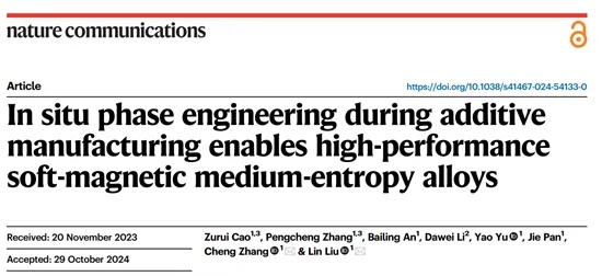 2024年 11月11日,《自然通讯》(Nature Communications)期刊在线刊发了材料学院柳林教授和张诚教授团队的最新研究成果“基于原位相调控的增材制造高性能软磁中熵合金”(In situ phase engineering during additive manufacturing enables high-performance soft-magnetic medium-entropy alloys)。材料学院曹祖睿硕士和张鹏程博士后为论文共同第一作者,材料学院张诚教授和柳林教授为论文共同通讯作者,材料科学与工程学院、材料成形与模具技术全国重点实验室为第一完成单位。