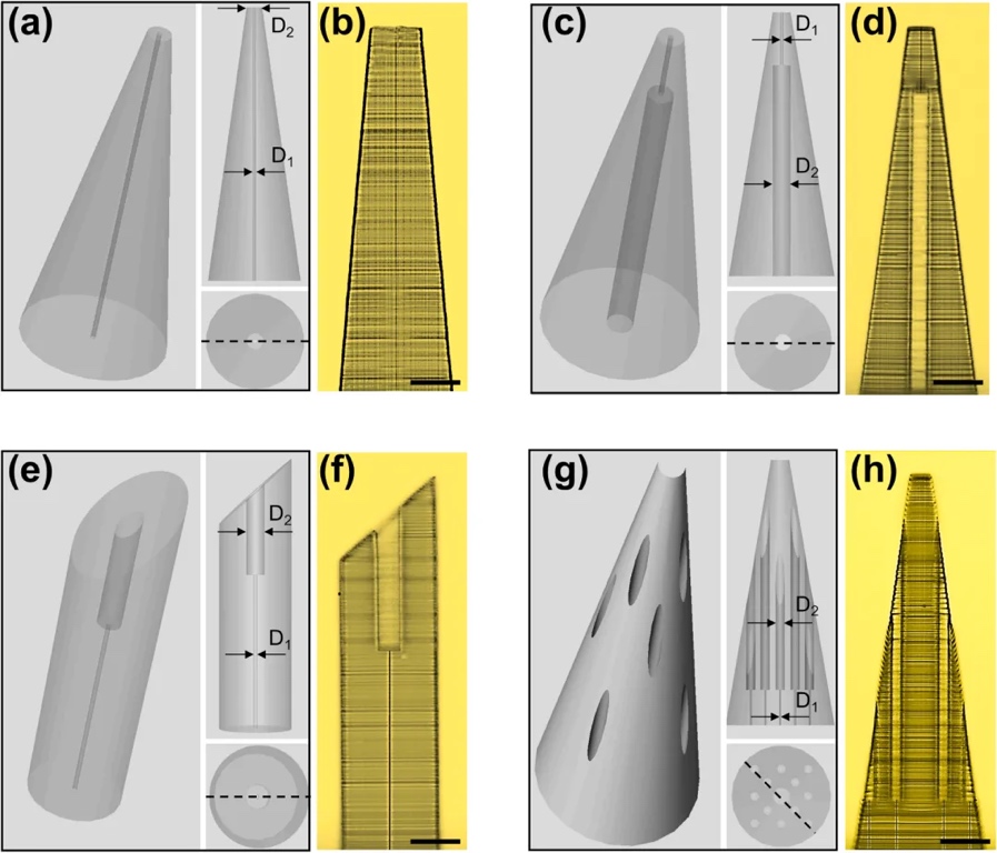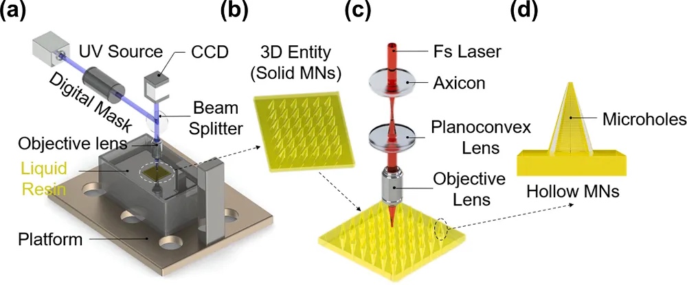 为此,北京理工大学姜澜院士、韩伟娜研究员团队提出了一种新型制造高精度三维微结构的加工方法(图1)。该团队采用摩方精密面投影微立体光刻(PµSL)3D打印技术和飞秒激光贝塞尔光束制孔相结合的方法创建了具有高度定制、精确结构(包括尺寸精度和深径比)和高效加工的三维结构。并将该技术成功应用于定制微针的生产,包括斜尖微针和多孔微针,证明了该技术具有广泛、高效的微孔加工能力,峰值制孔速度可达每秒20万个孔。这项技术不仅为制造具有微细腔体结构的三维器件提供了创新方法,而且具有广泛的工业应用前景。