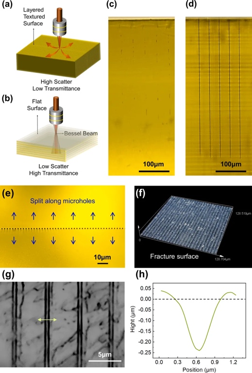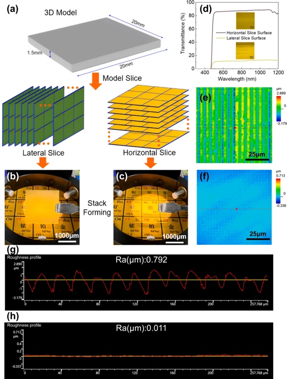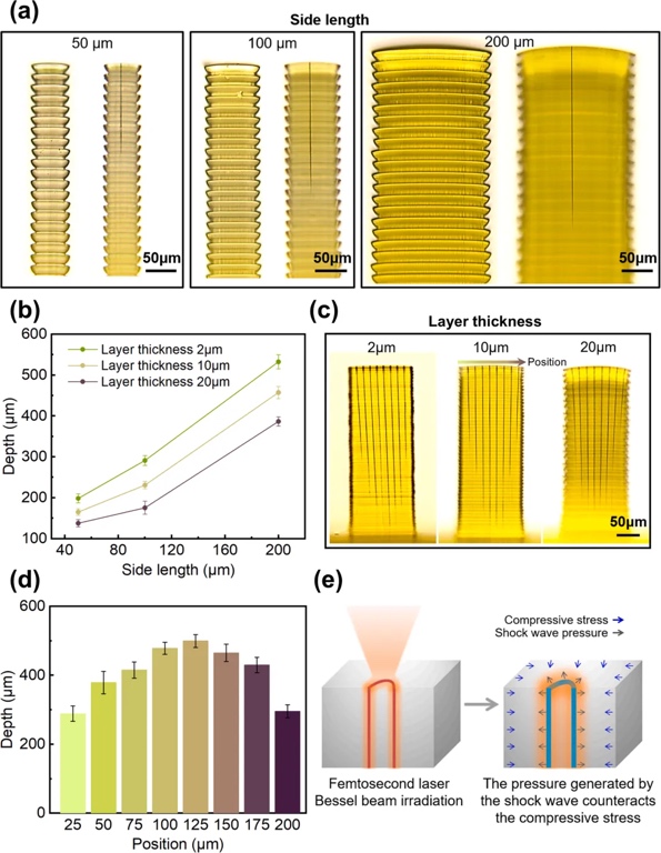 研究团队选用摩方精密BIO(生物兼容性)树脂作为打印材料,并使用microArch® S230(精度:2μm)3D打印设备进行实验。他们研究了3D打印样品的光学透明度对飞秒激光贝塞尔光束制孔能力的影响,并探究了不同切片方向对飞秒激光贝塞尔制孔成孔能力的影响。实验结果表明,横向切片可以实现稳定的微孔,并且通过加工排孔后沿孔裂片的方式,证明了该加工方法能够在三维打印实体中产生连续稳定的高深径比微孔结构。