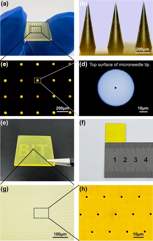 鉴于单个微针体积小,其载药和提取能力自然受限。因此,为充分发挥微针功效,通常以微针阵列的形式使用,以实现效率最大化。研究团队利用图像识别技术对每个微针进行精确定位,确保贝塞尔光束能够精确地对准每个微针的尖端中心,从而形成均匀且形状规则的微孔。在确保微孔加工质量的同时,贝塞尔光束的单脉冲穿孔机制还提供了高效的加工速度,实现了每秒高达20万个孔的峰值制孔速度。