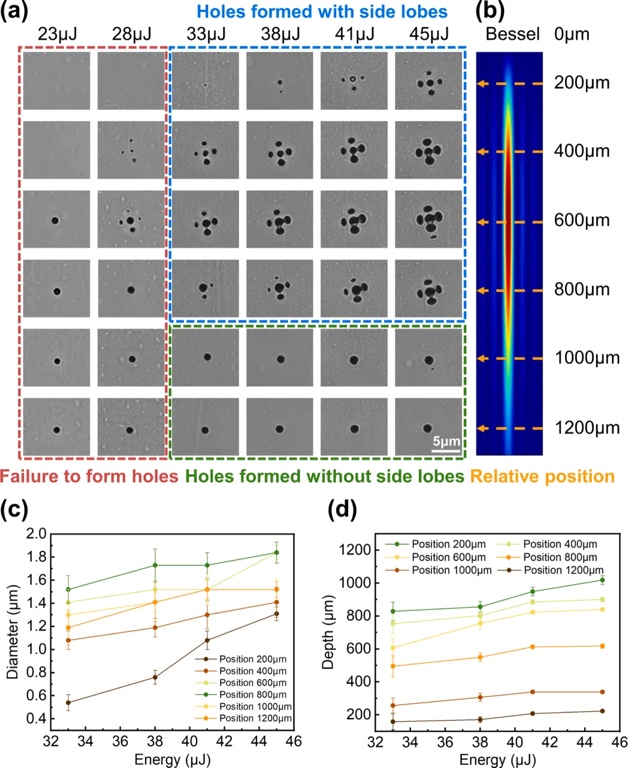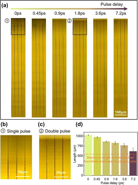 由于锥透镜的制造误差导致了贝塞尔光束的畸变,因此在利用贝塞尔光束轴向的上半段加工微孔时,会产生旁瓣现象(图4)。虽然使用贝塞尔光束的轴向下半段加工可以避免被加工微孔中出现旁瓣,然而,此举将会导致贝塞尔光束能量的大量损失,并对加工微孔的深度造成了限制。采用单脉冲处理的无侧叶微孔长度被限制在550 μm以内,显然未能充分利用贝塞尔光束的潜力。为此研究团队采用双脉冲贝塞尔光束技术,通过瞬态调控局部电子状态来消除旁瓣(图5)。当第一个脉冲照射材料时产生了大量的自由电子,这些自由电子改变了材料的瞬时局部特性,如反射率和透射率,从而抑制了材料对第二次脉冲能量的吸收,导致深度下降。旁瓣相对于主瓣的影响区域相对较短,导致旁瓣随着加工深度的减小而逐渐衰减。利用该方法加工而成的无旁瓣微孔长度均高于单脉冲条件下无旁瓣微孔的最大加工深度,且均超过800 μm,已接近当前激光条件下的加工深度极限。