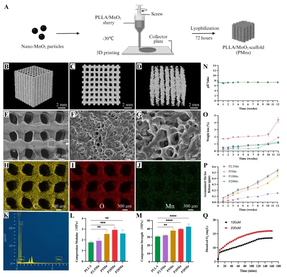 有鉴于此,来自中国科学院深圳先进技术研究院的赖毓霄等团队设计了一种由聚左旋乳酸(PLLA)和二氧化锰(MnO2)纳米颗粒组成的微环境响应支架,用于通过清除内源性活性氧物种(ROS)和在位调节免疫微环境来增强骨再生。
