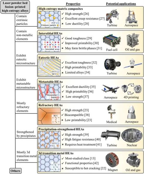 该篇综述将高熵合金分为七种类别:3d过渡金属高熵合金、共晶高熵合金、沉淀强化高熵合金、耐火高熵合金、亚稳态高熵合金、间隙高熵合金和高熵基复合材料 (如图1)。研究中详细分析了每种高熵合金在不同应用中的微观结构特征及其制造过程中的技术挑战。例如,通过激光粉床熔融制备的共晶高熵合金,具有优良的打印精度和机械强度,广泛应用于对力学性能和轻量化有极高要求的工程领域。