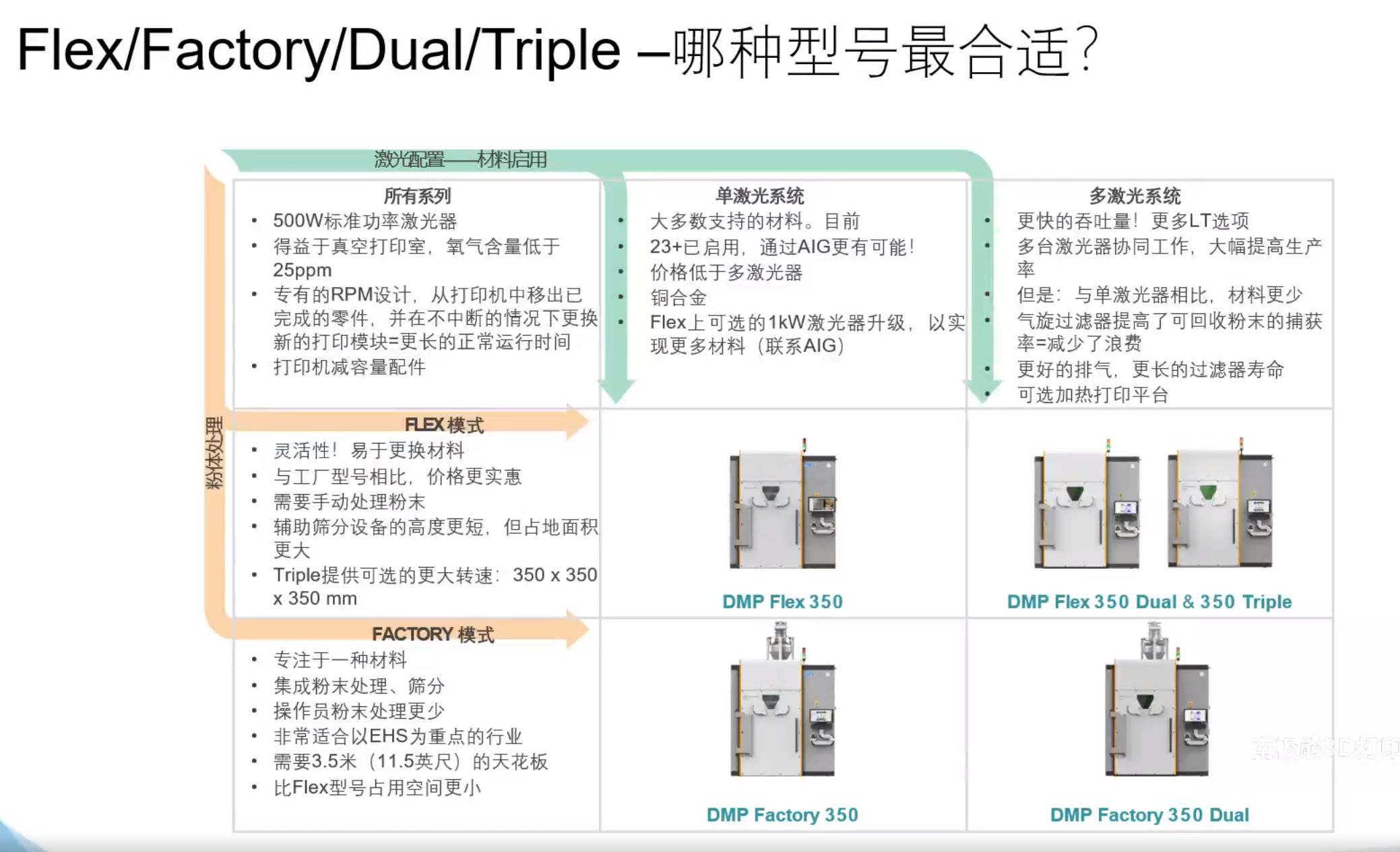 DMP 350不同打印机对应不同的应用场景,各种打印机应用特点可以参见上表。相对来说,Flex 350更加灵活,能够使用更多的材料。Factory 350最大的特点是集成了粉末处理和筛分,减少了材料的暴露和浪费,保护了操作人员的安全。Dual和Triple分别表示双激光系统和三激光系统。