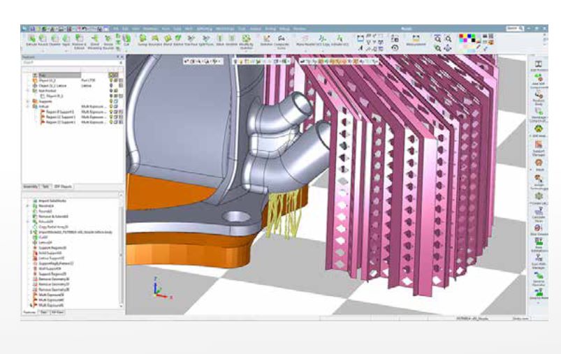3DXpert提供强大的模型布局工具,用户可以自由放置和排列模型,优化打印平台的利用率,最大化打印效率,减少材料浪费。软件支持自动或手动生成支撑结构,提供多种支撑类型(如树状支撑、片状支撑等),并详细设置支撑参数,确保复杂结构的稳定性和打印质量,减少后处理难度。通过将模型切片成多个层并生成详细的打印路径,3DXpert 支持多激光系统和多材料打印,优化打印路径,提高打印速度和精度。