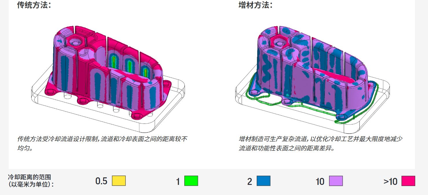 增材制造能够准确打印复杂的几何形状。采用传统方法创建高效的冷却流道极具挑战性。因为冷却流道往往具有不同深度,宽窄不一,并且模具表面容易出现卷曲。此外,增材制造还能加快设计迭代。