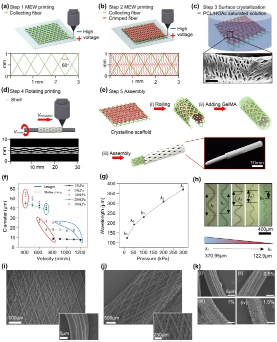 研究者首先采用MEW技术分别打印收集纤维和卷曲纤维层(图2(a)(b))。收集纤维直径为40-60um,作为收集第二层卷曲纤维的基础。收集纤维被设计成复制肌腱胶原纤维的螺旋结构,提供结构支撑并吸收径向张力下的变形。卷曲纤维的直径为5-10um,用于模拟胶原纤维的波浪结构。然后,将支架浸入过饱和PCL/乙酸(HOAc)溶液中,诱导纤维表面形成类似于胶原原纤维螺旋结构的纳米杂交Shish-Kebab结构(图2(c))。随后研究者通过旋转打印制备了多孔外壳,然后,将收集和卷曲的纤维卷成管状,并加入GelMA水凝胶。最终,通过组装正式支架和外壳结构创建MBT支架,如图2(e)所示。