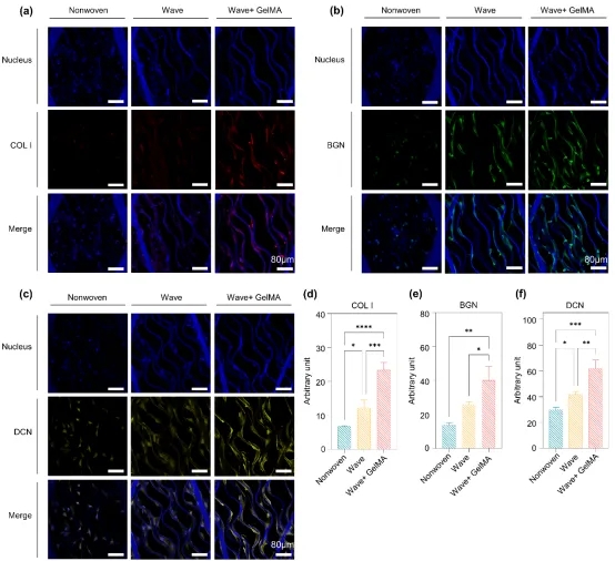 不仅如此,研究者证实了MBT支架能够显著促进TSPCs在体外的一型胶原蛋白、BGN和DCN的功能性表达,这证明了多尺度仿生支架在体外构建肌腱ECM中的有效性,对进一步作为组织替代品的应用具有重要意义(图5)。