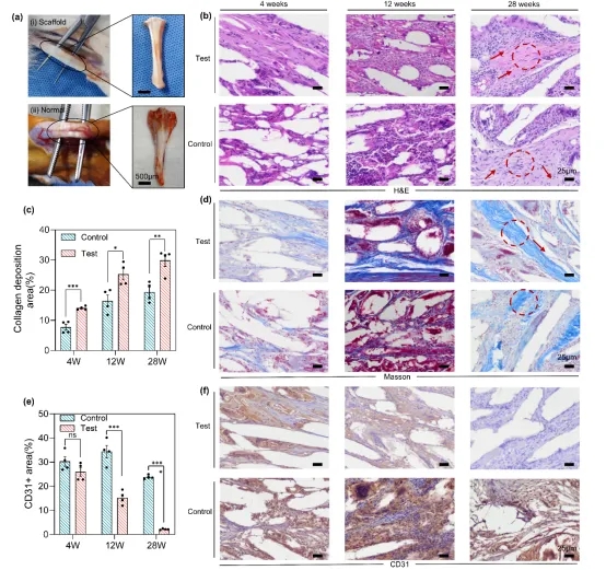 最后,研究者构建了兔全层肌腱损伤模型,将MBT支架缝合至肌腱缺损处,进一步评估MBT支架促进肌腱再生的作用。实验结果表明,MBT支架在早期愈合过程中可以促进肌腱再生;相较于对照组,实验组有更致密的胶原沉积,并呈现与实际组织相似的波纹结构;并且在12周时,实验组具有较少的CD31+区域,表明炎症细胞和血管减少,具有更好的修复效果。这些结果表面,与对照组相比,MBT支架在促进肌腱缺损快速再生方面具有更好的效果。