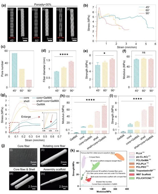 进一步,研究者研究了MBT支架的力学性能。在外壳支架部分,综合考虑力学性能及支架的可降解性,旋转45度作为外壳支架的打印参数。在核心支架部分,验证了MBT支架具有的波纹结构,能够仿生肌腱组织的J型应力-应变曲线特性(图3(g)),这种卷曲的形态允许纤维吸收更大的张力,有效地帮助管理相关肌肉或骨骼所施加的机械负荷。