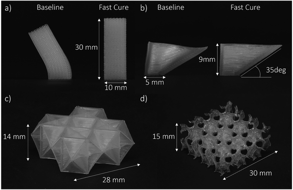 FC配方允许研究人员控制从混合到打印再到固化的整个过程,从而提高自支撑能力并改善形状保持性。与单组分基线相比,双组份FC墨水具有相似的流变性(流动特性),并成功打印了两种常见形状的木桩,形状保持性更好,下垂程度减少了约一半。Güell Izard和她的团队对这些结果感到非常兴奋,成功打印出了以前用硅胶难以实现的结构,例如高耸细长的结构、无支撑的锐利悬垂结构和基于壳的晶格结构,如螺旋状体和立方八面体,孔隙率高达90%。