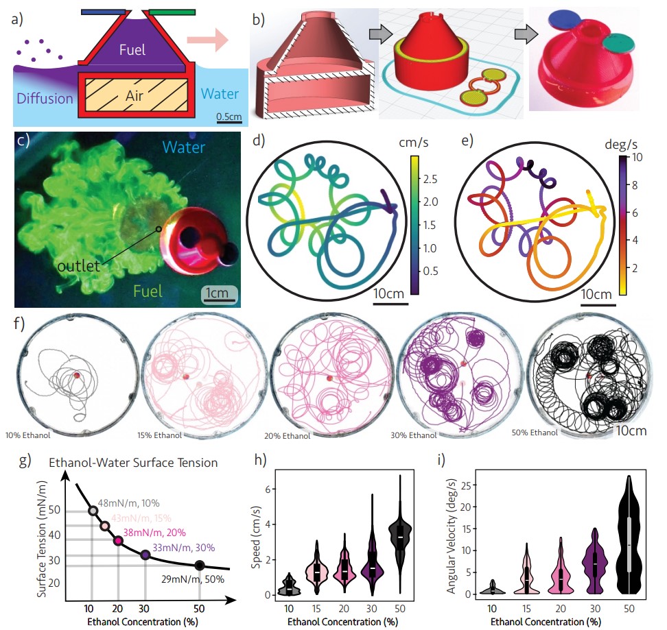 图1:马兰戈尼驱动粒子的设计理念、制造工艺和推进机制:a) 颗粒的概念设计横截面。b) 3D设计、G-code切片和3D打印最终设计的过程。c) 颗粒释放荧光标记的燃料并在表面自推进。d) 单出口50%乙醇驱动颗粒的轨迹。颜色表示颗粒的瞬时速度。e) 与面板d相同,但颜色表示瞬时角速度的大小。f) 单出口颗粒轨迹(n = 3),使用10%、15%、20%、30%和50%乙醇燃料浓度。g) 燃料类型之间的表面张力关系。h) 不同乙醇浓度下的速度分布。i) 不同乙醇浓度下的角速度分布。(图片来源:arXiv)