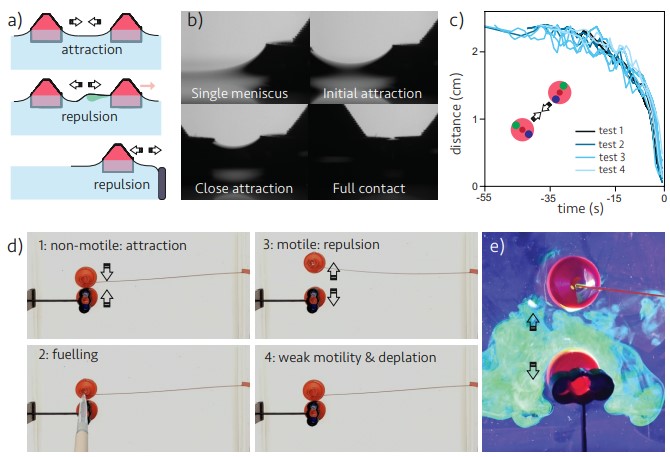 图2:水面上的颗粒相互作用。a) 疏水颗粒在表面相互吸引,而活跃颗粒则避免并可能排斥其他颗粒。同时,疏水壁面排斥颗粒。b) 两个颗粒通过变形界面连接的侧视图(Cheerios效应)。c) 多次测试中两个颗粒之间的距离,最初位于不同位置。d) 颗粒相互作用的演示。顶部颗粒附着在一个柔性悬臂上,而底部颗粒则固定在位置上,使用刚性(黑色)悬臂。最初,当非运动颗粒足够接近时,它们会相互附着。当通过注入燃料激活顶部颗粒时,颗粒通过水动力作用相互排斥。最终,当运动能力减弱且燃料耗尽时,Cheerios力再次占主导地位,颗粒相互吸引(见补充视频3)。e) Marangoni流动和排斥的开始可视化。底部颗粒未供能并固定在其位置上,而顶部颗粒附着在悬臂上,使用含有0.1%荧光素染料的30%乙醇-水混合物供能。