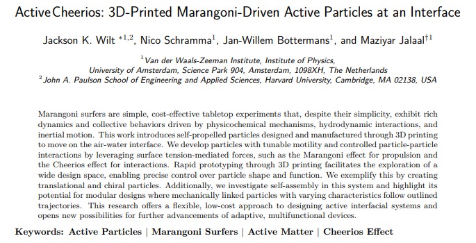 2024年12月9日,荷兰阿姆斯特丹大学的物理学家开发出了一种3D 打印粒子。这种粒子在获得适当燃料的情况下,能够利用马兰戈尼效应能够自行在流体表面推进。研究小组在arXiv线上发布了一篇题为“3D-Printed Marangoni-Driven Active Particles at an Interface”的论文。