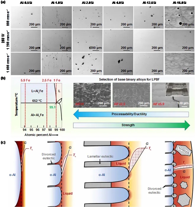 面对需要同时满足打印性能与高温性能的双重挑战,增材制造高温铝合金的研发主要有两种思路:①构建共晶凝固体系,②孕育处理。添加孕育剂和共晶体系的铝合金均能够在较大工艺窗口下实现高致密度成形,随后通过合金元素的筛选,实现良好的耐热性能,已成为当前解决耐热铝合金增材制造难题的重要手段。