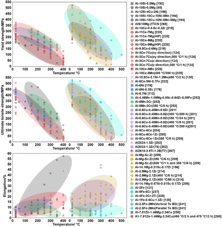 航空航天、汽车等高端制造领域关键零部件的轻量化、复杂化、整体化需求日益增长,铝合金增材制造技术已成为解决轻质复杂构件整体成形难题的有效途径。现有关键零部件的高温服役需求与应用场合逐渐增加,但常规铝合金在中高温区间(250-450°C)强化相快速粗化甚至溶解,屈服强度发生断崖式下降,无法满足耐热结构件的使役要求,转而采用成本更高、质量更重的钛合金替代。因此,亟需研发面向增材制造的耐热铝合金,实现“以铝代钛”,满足构件轻量化和经济性的双重需求。目前耐热铝合金增材制造已成为增材制造领域的研究热点之一,初步形成了适用于增材制造工艺特点的成分设计策略与合金体系,并围绕打印/调控工艺、耐热相形成与高温性能及其强化机制开展了广泛研究。